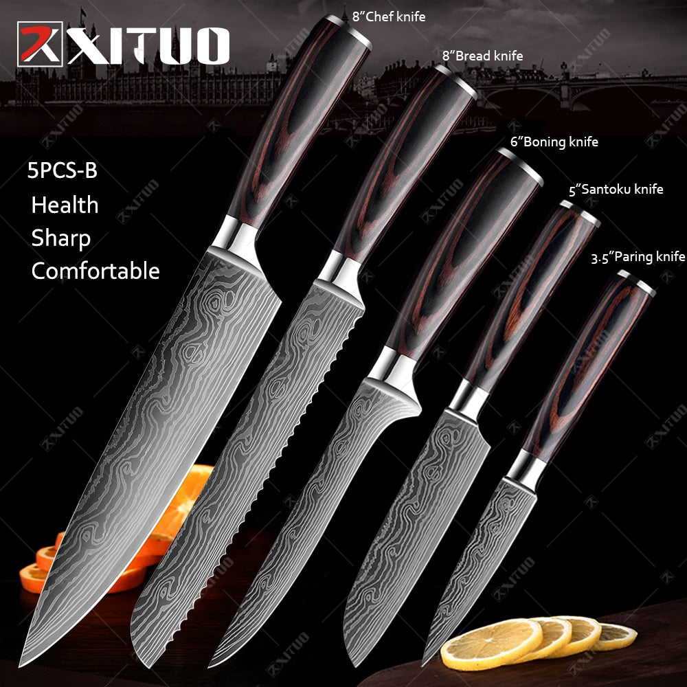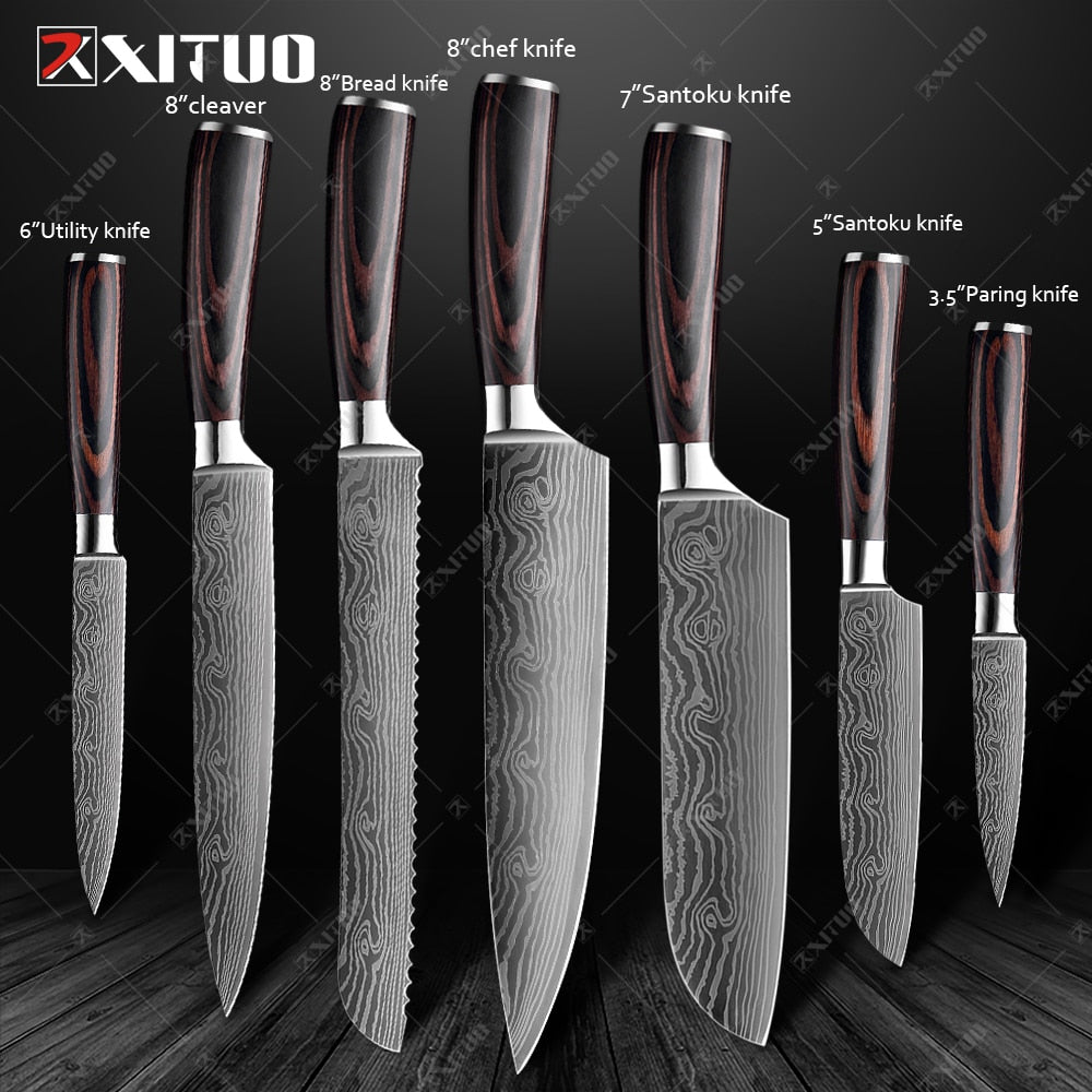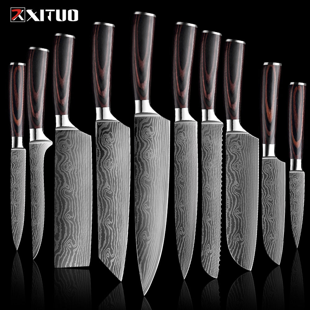 Conjunto de 1 a 10 peças de grande valor, com ele você não precisa mais de outras facas de cozinha! Faca de chef de 1*8 polegadas 1 * 8 polegadas faca Kiritsuke Faca de pão de 1*8 polegadas Faca de corte de 1*8 polegadas Faca cutelo de 1*7 polegadas 1 * 7 polegadas faca Santoku 1 * 6 polegadas faca de desossar 1 * 5 polegadas faca Santoku Faca de bife de 1*5 polegadas 1 * 3,5 polegadas faca de descascar