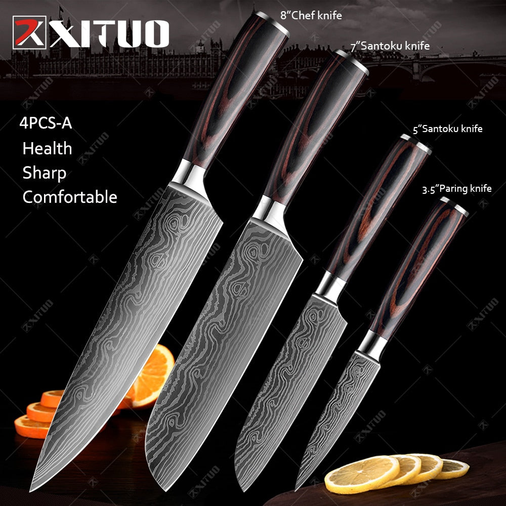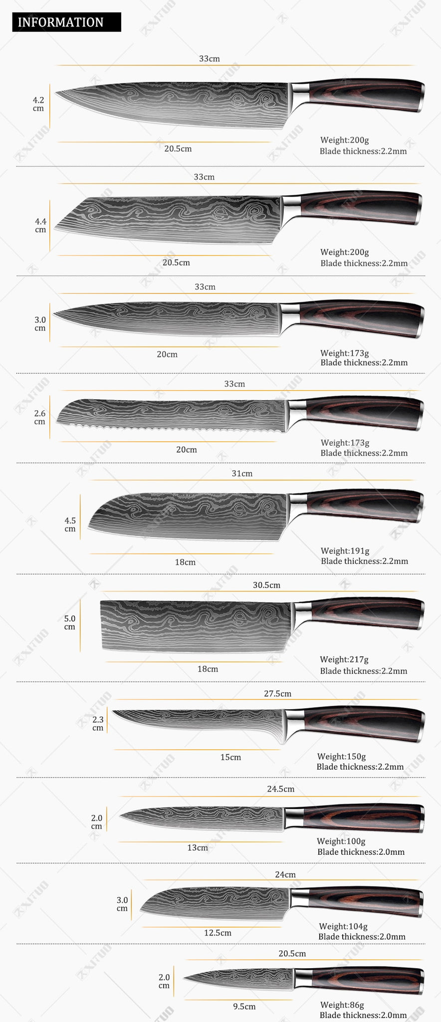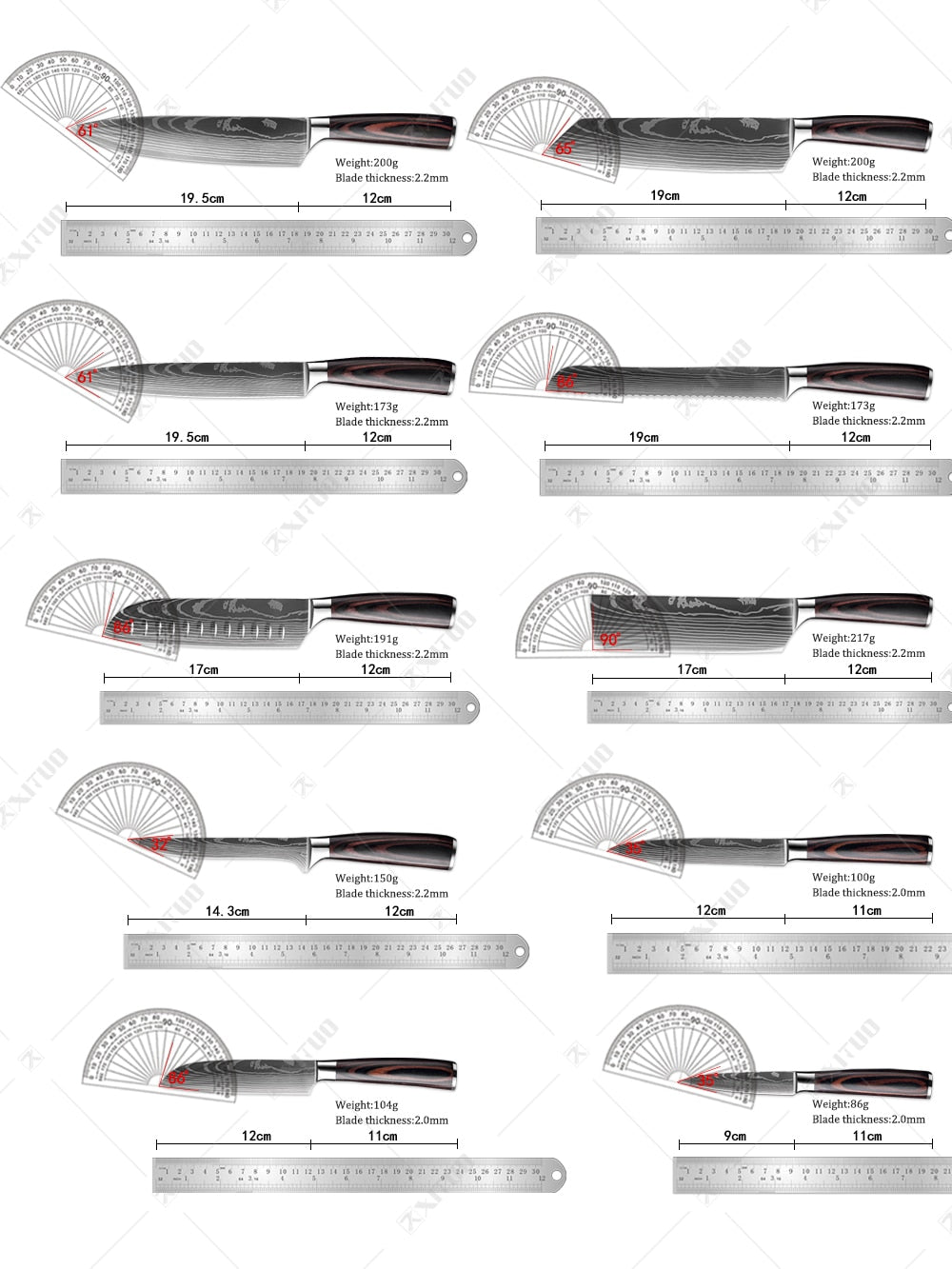 Conjunto de 1 a 10 peças de grande valor, com ele você não precisa mais de outras facas de cozinha! Faca de chef de 1*8 polegadas 1 * 8 polegadas faca Kiritsuke Faca de pão de 1*8 polegadas Faca de corte de 1*8 polegadas Faca cutelo de 1*7 polegadas 1 * 7 polegadas faca Santoku 1 * 6 polegadas faca de desossar 1 * 5 polegadas faca Santoku Faca de bife de 1*5 polegadas 1 * 3,5 polegadas faca de descascar