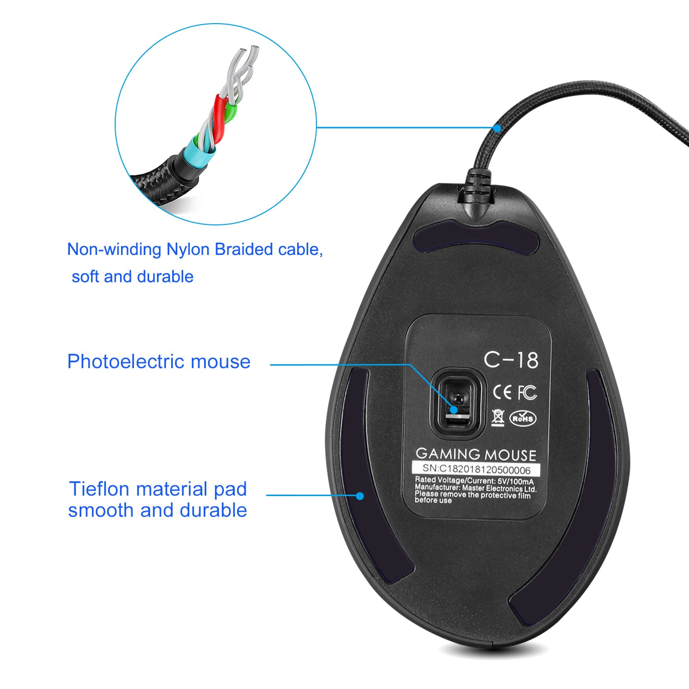 ESPECIFICAÇÕES Comprimento do cabo USB:: 1,8 m Tipo: COM FIO Controle de tração:: Óptica Taxa de retorno:: 125-1000Hz Tamanho do produto:: 110*72*76,5mm Tipo de energia: recarregável Modo de Operação: Opto-eletrônico Número de rolos: 1 unid. Número de botões: 11 Tipo de Interface: USB Orientação da Mão: Direita Peso Bruto: 165g Feature6:: mouse a laser com fio DPI: 10000 Certificação: CE Nome da marca: Lefon DPI ajustável:: 1500-2500-4000-7000-10000