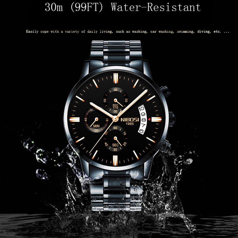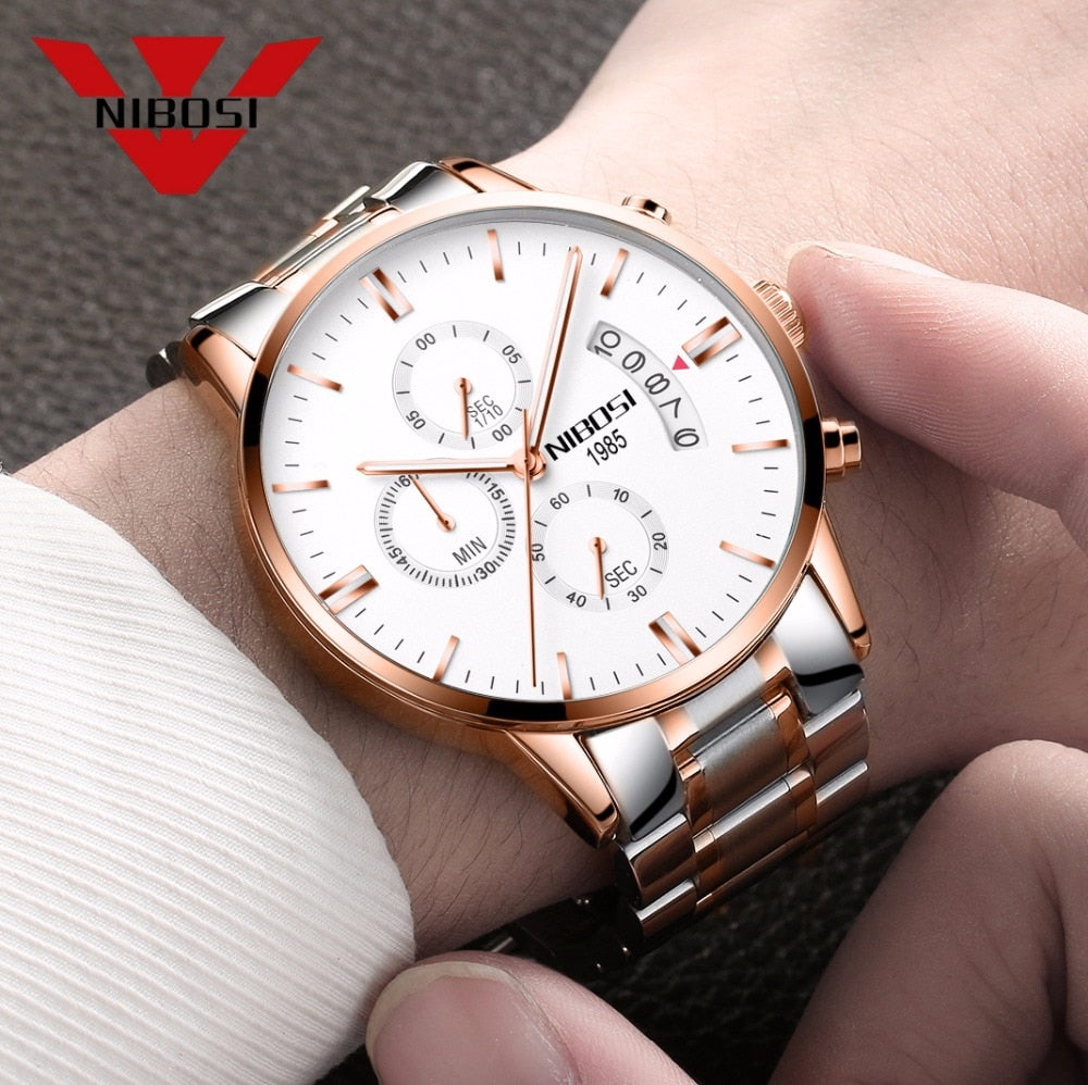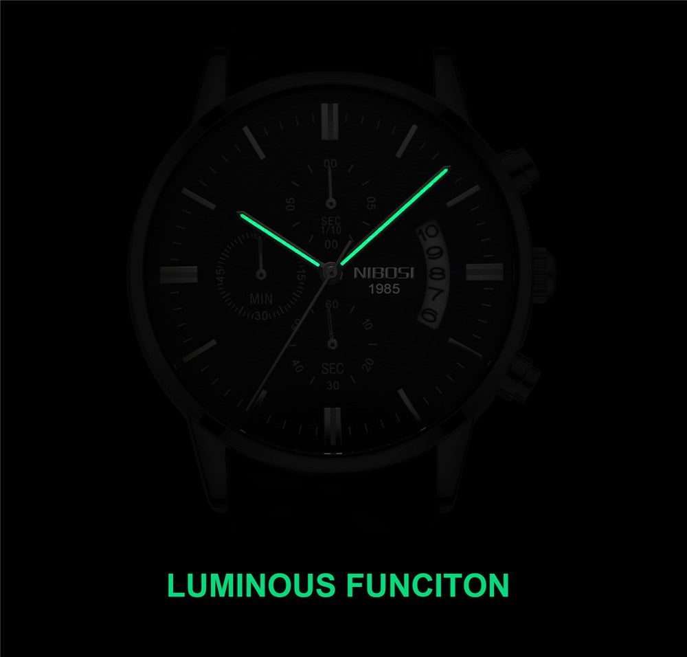 ESPECIFICAÇÕES Profundidade de Resistência à Água: 3Bar Estilo: Moda e Casual Conteúdo da Embalagem: Relógio Masculino; Caixa Elegante; Ferramenta de observação; pano limpo Origem: China Continental Movimento: Quartzo Montre Homme: relógio de quartzo masculino Relógios masculinos: relógios masculinos de luxo da melhor marca Tipo de item: relógios de pulso de quartzo Característica: Calendário Completo, Resistente à Água, Cronógrafo, Luminoso Tipo de material da janela de discagem: Hardlex Diâmetro do Mostrador: 43mm Tipo de fecho: Fecho oculto com botão de pressão Espessura da Caixa: 10mm Formato da Caixa: Redondo Material da Caixa: Aço Inoxidável Nome da marca: NIBOSI Caixas e Estojos Material: Papel Largura da banda: 22mm Tipo de Material da Banda: Aço Inoxidável Comprimento da faixa: 25 cm